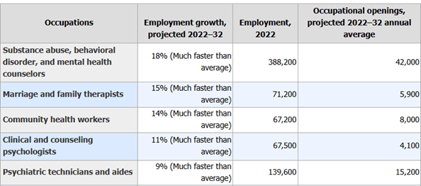 Figura 1 - Cantidad de empleos (2022 y proyectado 2022-32) en ocupaciones que brindan servicios de salud mental